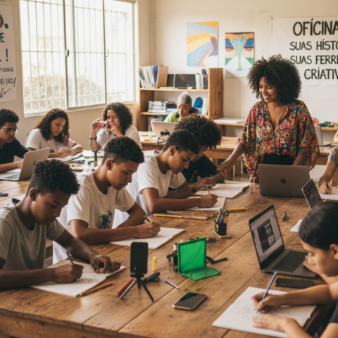 Atividades formativas que incentivam jovens a contar suas próprias histórias através de ferramentas criativas.